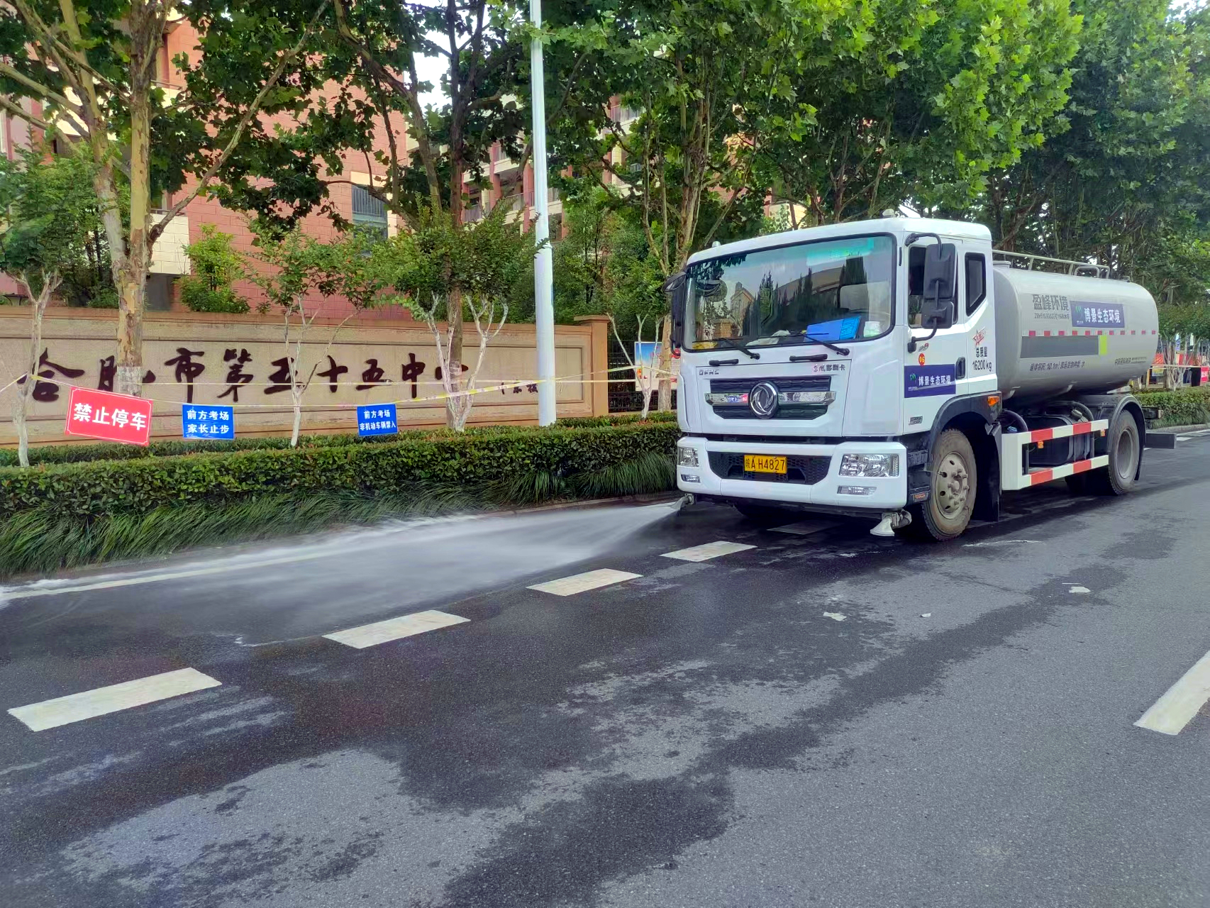 為確保考點周邊的環境清潔安靜,環衛作業高效、高質、高量地開展,博景生態環境安排水車及機掃車對考點周邊進行提前作業,避開考試時間,實行錯峰清潔,保證在考生到達考點之前完成學校周邊的道路清洗。